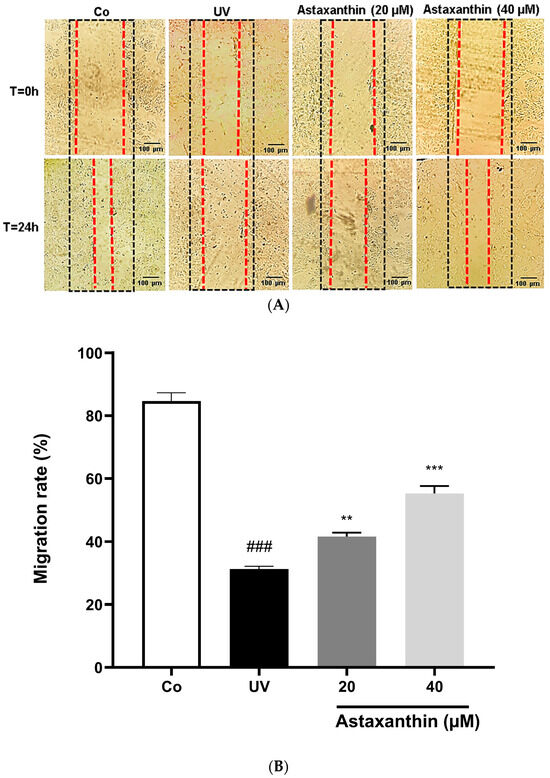 Effect of astaxanthin on the migration of HaCaT cells. Cells were pre-treated with 20 or 40 µM of astaxanthin for 2 h. (A) Photos were taken immediately after scratch (T0) and at 24 h after the treatment. Following UVB exposure (30 mJ/cm2), migration was assessed after 24 h. (B) The area of astaxanthin-treated cells and untreated cells was measured using ImageJ (Version 1.54g, National Institutes of Health, USA). Dashed lines indicate the initial wound boundary. Scale bar = 100 µm. Results are expressed as mean ± SEM. Statistical significance was determined by one-way ANOVA with Dunnett’s post-hoc test. ### p < 0.001 vs. control (Co); ** p < 0.01, *** p < 0.001 vs. UV-exposed cells.