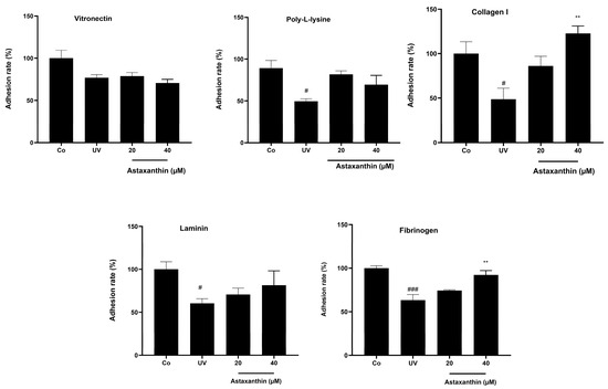 Effect of astaxanthin on UVB-induced alterations in HaCaT cell adhesion to extracellular matrix (ECM) proteins. HaCaT cell suspensions were pre-treated with astaxanthin extract (20 and 40 µM) at 37 °C before UVB exposure. Following irradiation, cells were seeded into ECM protein-coated Nunc multiwell plates (vitronectin, fibrinogen, laminin, collagen IV, or poly-L-lysine). After incubation, non-adherent cells were removed, and adhesion rate was estimated. The results are expressed as the mean ± SEM. # p < 0.05, ### p < 0.001 vs. Co group, ** p < 0.01.