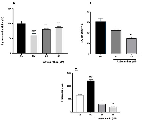 Effect of astaxanthin on lysosomal activity, NO and ROS production of keratinocyte following UVB exposure. Keratinocytes were pre-incubated with astaxanthin (25 and 50 µg/mL) for 2 h, then exposed to UVB irradiation (30 mJ/cm2). (A) Lysosomal activity was evaluated as an indicator of cellular metabolic function and recovery. (B) Nitric oxide (NO) production was quantified to assess oxidative stress response. (C) To assess ROS production, 5 μL of 25 μM 2′, 7′-dichlorofluorescein diacetate DCFH-DA was added to each well. Fluorescence was determined between 538 nm (emission) and 485 nm (excitation). Results were analyzed using a one-way ANOVA, followed by Dunnett’s post-hoc test to compare treated cells with the untreated ones and UV-treated cells. ### p < 0.001 vs. Co group; ** p < 0.01, *** p < 0.001 vs. UV-treated cells.