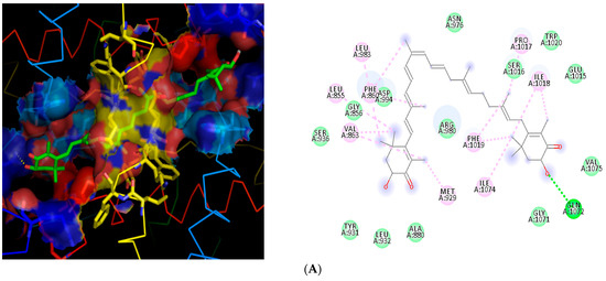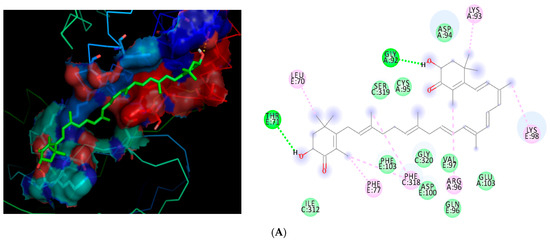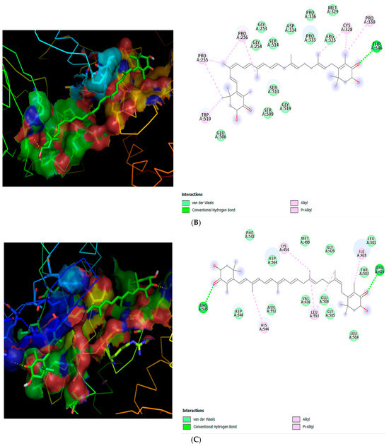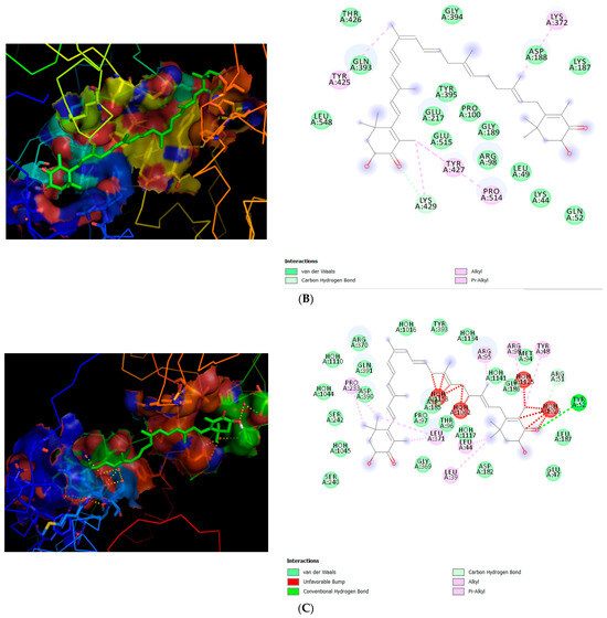 2D and 3D binding interactions of astaxanthin with NF-κB, MMP2, and MMP9. 2D and 3D dimensional representations of the binding interactions between astaxanthin (A) NF-κB p65 (PDB: 1NFI), (B) MMP2 (PDB: 1CK7), and (C) MMP9 (PDB: 1L6J). Astaxanthin is shown in green stick representation, while the surrounding amino acid residues are displayed as colored lines. The protein surface is colored according to electrostatic potential, with red indicating negatively charged regions, blue indicating positively charged regions, and neutral regions shown in yellow.