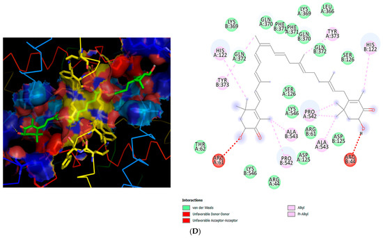 2D and 3D interaction profiles of astaxanthin with JAK2, STAT3, FAK, and COX-2 2D and 3D dimensional representations of the binding interactions between astaxanthin and the active sites of (A) JAK2 (PDB: 4BBE), (B) STAT3 (PDB: 6NJS), (C) FAK (PDB: 4Q9S), and (D) COX-2 (PDB: 5IKR). Astaxanthin is shown in green stick representation, while the surrounding amino acid residues are displayed as colored lines. The protein surface is colored according to electrostatic potential, with red indicating negatively charged regions, blue indicating positively charged regions, and neutral regions shown in yellow.