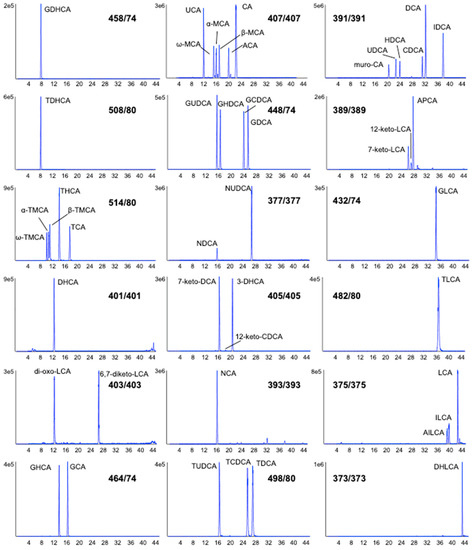 - Han, J.; Liu, Y.; Wang, R.; Yang, J.; Ling, V.; Borchers, C.H. Metabolic profiling of bile acids in human and mouse blood by LC-MS/MS in combination with phospholipid-depletion solid-phase extraction. Anal. Chem. 2015, 87, 1127–1136. [Google Scholar] [CrossRef]