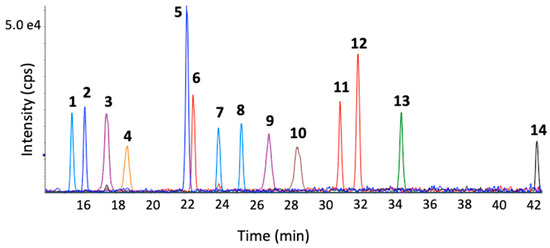 Representative LC-MRM chromatograms from a 20 μL injection of IS mix containing 0.013-0.1 μM final concentration of each IS compound. (1) d4-GUDCA (2) d4-GCA (3) d4-TUDCA (4) d4-TCA (5) d4-CA (6) d4-UDCA (7) d4-GCDCA (8) d4-GDCA (9) d4-TCDCA (10) d6-TDCA (11) d4-CDCA (12) d4-DCA (13) d4-GLCA (14) d4-LCA.