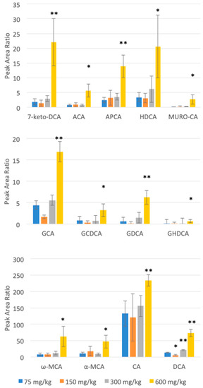 Peak area ratios for bile acids having significant changes between 75 mg/kg and 600 mg/kg APAP dosing, as measured in rat plasma after 24 h. * p-value < 0.05, ** p-value < 0.01.