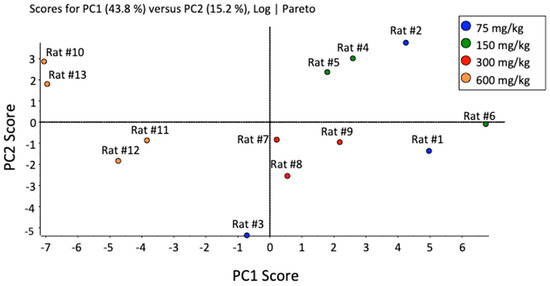 The LC-MRM data was imported into metabolomics software (MarkerViewTM) to perform statistical analyses (Student’s t-test, as shown previously) and also to visualize data presented within a principal component analysis (PCA). Figure 4 shows the PCA plot of the first two principal components (PC1 vs. PC2), with Pareto scaling to alleviate bias to highest peaks. This plot shows clearly that the highest dose of 600 mg/kg clusters separately to the three lower doses (75, 150, and 300 mg/kg), as was evident from the t-testing results of the individual bile acids. The PCA plot, which used all features from the LC-MRM data, following supervised peak integration, serves to show that the high dose had a marked effect compared to the three lower doses, instead of seeing a gradual shift between the four doses.