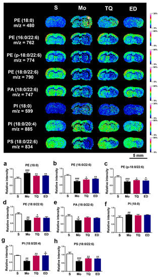 - Shanta, S.R.; Choi, C.S.; Lee, J.H.; Shin, C.Y.; Kim, Y.J.; Kim, K.H.; Kim, K.P. Global changes in phospholipids identified by MALDI MS in rats with focal cerebral ischemia. J. Lipid Res. 2012, 53, 1823–1831. [Google Scholar] [CrossRef] [PubMed]