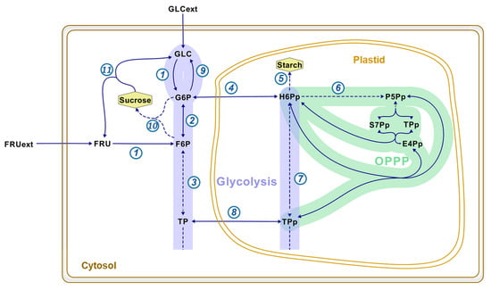 Representative example of maize embryos to illustrate the subcellular compartmentation of hexose-phosphates in plant cells. Developing maize embryos mainly import glucose and fructose as carbon sources. These sugars get phosphorylated into hexose-phosphate in the cytosol. The resulting hexose-phosphates are involved in major pathways: glycolysis (purple), and the oxidative pentose-phosphate pathway (OPPP; green). Full and dashed arrows represent one reaction or a multiple-step reaction, respectively: 1 is hexokinase; 2, phosphoglucose isomerase; 3 and 7, cytosolic and plastidial aldolases, respectively; 4 and 8, exchange of hexose-phosphates and triose-phosphates between cytosol and plastid, respectively; 5, starch synthesis; 6, oxidative part of the OPPP; 9, glucose 6-phosphatase; 10, sucrose phosphate synthase; and 11, invertase. Abbreviations in alphabetical order: E4Pp, plastidic erythrose 4-phosphate, FRU(ext), (extracellular) fructose; F6P, fructose 6-phosphate; GLC(ext), (extracellular) glucose; G6P, glucose 6-phosphate; H6Pp, plastidic hexose-phosphates; P5Pp, plastidic pentose-phosphates; S7Pp, plastidic sedoheptulose 7-phosphate; TP(p), (plastidic) triose-phosphates.