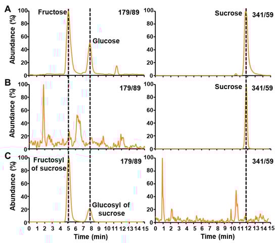LC-MS/MS chromatograms of free sugars before and after enzymatic treatments. (A) shows the chromatographic separation and mass spectrometric detection of fructose, glucose (transition 179/89), and sucrose (transition 341/59) after boiling water extraction of unlabeled maize embryos. (B) and (C) represent the LC-MS/MS chromatograms obtained after hexokinase and invertase treatments, respectively. LC-MS/MS chromatograms for hexoses and sucrose were obtained using MRM scan survey approach as indicated in the Materials and Methods.