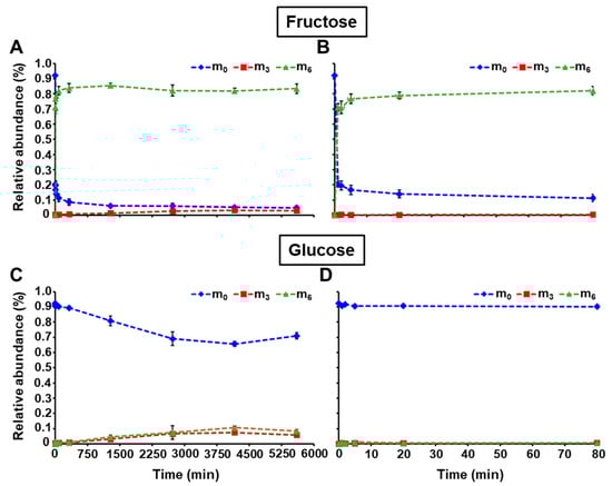 Relative abundance of isotopomers for intracellular fructose and glucose during pulse labeling with [U-13C]fructose. (A,C) show the relative abundance of mass isotopomers at all time points for fructose and glucose, respectively. (B,D) represent the relative abundance of mass isotopomers from 0 to 80 min for fructose and glucose, respectively. Intracellular glucose and fructose were extracted, and analyzed as described in the “Materials and Methods” section. Mass relative abundances (in %) were reported as the average ± SD (n = 4 biological replicates). Mass isotopomers m0, m3, and m6 are depicted as blue diamond, red square, and green triangle, respectively.