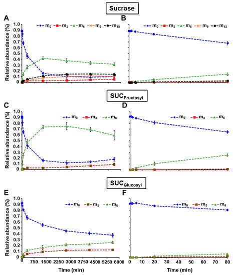 Relative abundance of isotopomers for 13C-fructosyl and 13C-glucosyl units from sucrose during the pulse labeling experiment. (A,C,E) represent the relative abundance of mass isotopomers at all time points for sucrose, SUCFructosyl, and SUCGlucosyl, respectively. (B,D,F) depict the relative abundance of mass isotopomers from 0 to 80 min for sucrose, SUCFructosyl, and SUCGlucosyl, respectively. Sucrose was extracted, cleaved into its fructosyl and glucosyl units, and analyzed as described in the Materials and Methods section. Mass relative abundances (in %) were reported as the average ± SD (n = 4 biological replicates). Mass isotopomers m0, m3, m6, m9, m12 are shown as blue diamond, red square, green triangle, orange cross, and black circle, respectively. SUCFructosyl: Sucrose fructosyl; SUCGlucosyl: Sucrose glucosyl.