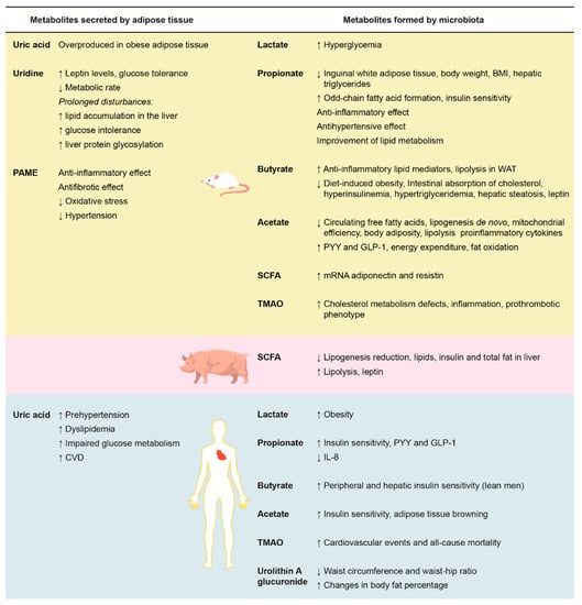 Pathological conditions, such as obesity, can significantly reduce or increase communication between different organs. In this sense, a number of mechanisms seem to explain the relationship between adipose tissue and intestine through interaction with the intestinal microbiota [16]. Among them are included the formation of metabolites, such as SCFA (acetate, propionate and butyrate) [154], and the production of intermediate metabolites, such as lactate and TMA.