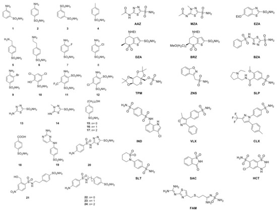 - Alterio, V.; Di Fiore, A.; D’Ambrosio, K.; Supuran, C.T.; De Simone, G. Multiple binding modes of inhibitors to carbonic anhydrases: How to design specific drugs targeting 15 different isoforms? Chem. Rev. 2012, 112, 4421–4468. [Google Scholar] [CrossRef]