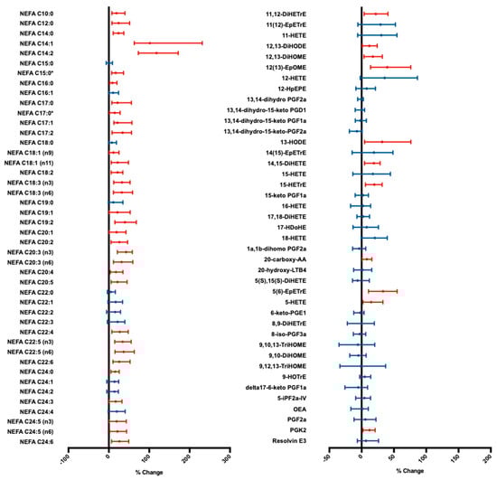 Forest plot of median non-esterified fatty acid (NEFA; left panel) and oxylipin (right panel) species plasma concentration change during cold exposure. Error bars indicate 95% confidence intervals. p values calculated using a Wilcoxon signed-rank test (n = 14). Significant changes (p < 0.05) shown in red; statistically insignificant changes shown in blue. * Indicates branched isomers. DiHETrE—dihydroxyeicosatrienoic acid; EpETrE—epoxyeicosatrienoic acid; DiHODE—dihydroxyoctadecadienoic acid; DiHOME—dihydroxyoctadecenoic acid; EpOME—epoxyoctadecenoic acid; HETE—hydroxyeicosatetraenoic acid; HpEPE—hydroperoxyl-eicosapentaenoic acid; PG—prostaglandin; HODE—hydroxyoctadecadienoic acid; DiHETE—dihydroxy-eicosatetraenoic acid; HDoHE—hydroxy-docosahexaenoic acid; AA—arachidonic acid; LT—leukotriene; HOTrE—hydroxyoctadecatrienoic acid; TriHOME—trihydroxyoctadecenoic acid; iP—isoprostane; OEA—oleoylethanolamine.
