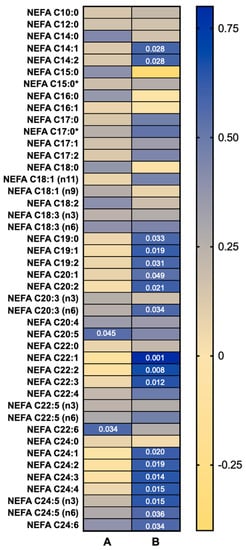 Heat map of Pearson’s r values of correlations between (A) plasma non-esterified fatty acid (NEFA) species baseline concentration and (B) concentration change after 90 min mild cold exposure against brown adipose tissue (BAT) activity (SUVmean) (n = 14). Significant correlations (p < 0.05) indicated by the p values within the heat map. * Indicates branched isomers.