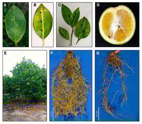 The characteristic symptoms of huanglongbing (HLB) disease. (A) Blotchy mottle symptom on HLB-positive citrus leaves with asymmetric patterns of discolorations around the leaf midvein; (B) Yellow vein symptom on HLB-positive citrus leaves; (C) Leathery leaves with enlarged corky veins from HLB-affected trees; (D) Lopsided, asymmetric, and small-sized fruits from HLB-affected trees; (E) HLB-induced preharvest fruit drop; (F,G) The root system of HLB-free (healthy) and HLB-positive trees, respectively. Photos used in panels (A–D) were provided by Dr. Pedro C. Gonzalez-Blanco whereas the photo used in panel (E) was provided by Dr. Tripti Vashisth, Department of Horticultural Sciences, Citrus Research and Education Center, University of Florida. Photos used in panels (F) and (G) were provided by Dr. Evan Johnson, Department of Plant Pathology, Citrus Research and Education Center, University of Florida.