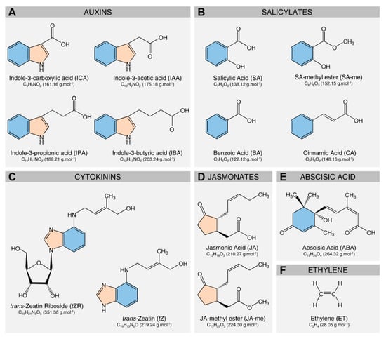 The chemical structures of different phytohormones discussed throughout this review. (A) auxins, (B) salicylates, (C) cytokinins, (D) jasmonates, (E) abscisic acid, and (F) ethylene. Molecular weights (g·mol−1) are mentioned between parentheses beside the chemical formula of each compound.