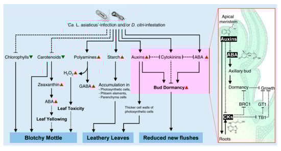 At severe infection stages, ‘Ca. L. asiaticus’ infection diminishes the development of new flushes on the HLB-infected trees or it forms shoots with compressed internodes and small upright leaves, showing a symptom commonly known as “rabbit-ears” [83,84]. We believe that phytohormones (Figure 2) are intimately involved in the reduction of the frequency of vegetative flushes and leaf size (Figure 3), particularly the auxin/cytokinin ratio. Taking together the facts, (I) activation of dormant buds is a complex process and extremely finely tuned [85]; (II) several environmental factors and endogenous signals regulate the development of vegetative flushes and shoot system architecture, particularly auxins and cytokinins [85,86,87,88]; (III) auxins are synthesized in the apical meristems and then translocated basipetally (downward through the phloem) and suppress axillary bud outgrowth [85,86]; (IV) cytokinins are synthesized in the root tip meristems, travel acropetally (upward through the xylem), and promote/stimulate axillary bud outgrowth [85,86]; (V) both auxins and cytokinins interact antagonistically and are affected by relative auxin/cytokinin ratio [85,86,87,88]; (VI) our previous study demonstrated that infection with ‘Ca. L. asiaticus’ increased the endogenous levels of three auxins (IAA, IPA, and IBA) but did not alter the cytokinin (trans-zeatin and trans-zeatin riboside) contents, which distorted the auxin/cytokinin ratio [58]. Collectively, we propose that the auxin/cytokinin ratio regulates the initiation and development of vegetative buds. In Ca. L. asiaticus’-infected trees, the higher auxin content might prevent the outgrowth of vegetative buds and decrease the frequency of new flushes. We believe that the inhibitory activity of auxins is mediated by a second signal such as cytokinins, ABA, and bud-specific proteins (Figure 3).