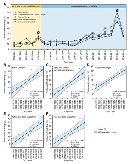 The estimated preharvest fruit drop rate was increased up to 30% in navel oranges (Figure 4B), early-mid-season non-Valencia oranges (Figure 4C), and Valencia oranges (Figure 4D), and up to 40% in white and red seedless grapefruits (Figure 4E,F, respectively). The simple linear regression showed that the preharvest fruit drop rate (%) was positively correlated with the crop year (time), with the coefficient of determination higher than 70% (R2 > 0.7) (Figure 4). This dramatic increase in mature fruit drop is a consequence of the widespread invasiveness of ‘Ca. L. asiaticus’ and the epidemic of HLB in Florida, the inaccessibility of curative treatment, and the absence of HLB-resistant varieties [12,102,103].