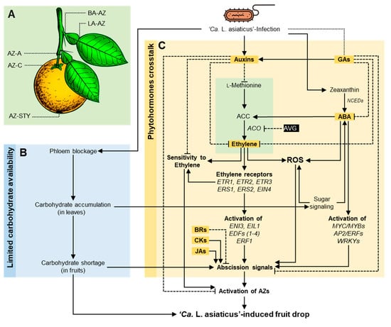 Hypothetical model of the potential roles of citrus phytohormones and carbohydrate availability in the HLB-induced preharvest fruit drop. (A) Citrus leaf and fruit abscission zones (AZs). There are five well-defined AZs in citrus. The leaf AZs are located between the shoot and the petiole (BA–AZ; also known as Branch–AZ or Basal–AZ) and between the petiole and the blade (LA–AZ; also known as Laminar–AZ), whereas the fruit AZs are located between the shoot and the peduncle (AZ–A), between the calyx and the fruit itself (AZ–C), and between the fruit and the style (AZ–STY). (B,C) Two hypothetical models that discuss the potential role of carbohydrate availability and phytohormone imbalance, respectively, in HLB-induced preharvest fruit drop. Briefly, the first hypothesis is based on that ‘Ca. L. asiaticus’ infection induces collapse and proliferation of phloem cells and plugging of sieve pores in citrus leaves causing phloem blockage, which could block the carbohydrate flow in the phloem, causing limited carbohydrate availability to the citrus fruits. The second hypothesis was built on the phytohormonal imbalance at the AZs, which might play a key role in the regulation of cell separation processes and, eventually, fruit drop. Several phytohormone groups might be implicated in abscission processes, including auxin and indole derivatives, ethylene and its precursors, abscisic acid (ABA), gibberellins (GAs), cytokinins (CKs), brassinolide (BRs), and jasmonates and their methyl ester (JAs).