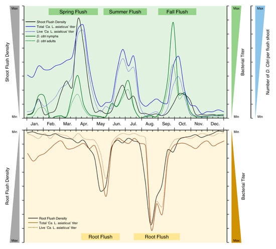 Population dynamics of ‘Candidatus Liberibacter asiaticus’ and its insect vector, Asian citrus psyllid, Diaphorina citri (Hemiptera: Liviidae), in relation to the annual flushing cycles and root growth patterns of citrus trees in Florida. The data presented in this figure were adapted from previously published data by [138,139,140,141,142,143,144,145,146,147,148,149,150,151,152].