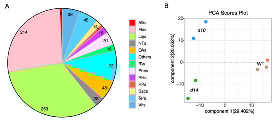 To capture a wide range of metabolic responses to SLs in rice, a previously established and developed widely targeted metabolomics method [48] was used with the WT and previously created biosynthesis and perception mutants, namely, d10 and d14 [49]. The leaves of each genotype from the rice plants grown with hydroponic culture were sampled and extracted. The extracts were then subjected to an HPLC-ESI-MS/MS analysis. In total, 794 compounds were detected (Table S1). These included both primary and secondary metabolites: (i) the majority of the primary metabolites were derived from lipid metabolism, such as phosphatidylcholines (PCs) and lysophosphatidylcholines (lysoPCs); (ii) various pathways were associated with the secondary metabolites detected, including 214 flavonoids and 45 terpenoids (Figure 1A). The metabolomic data of the WT and mutants were clustered into three distinct groups after an unsupervised principal component analysis (PCA) of all the detected metabolites with log10 values (Figure 1B). The PCA showed that the first two principal components (PC1 and PC2) accounted for approximately 49% of the total differences among the three genotypes (Figure 1B).