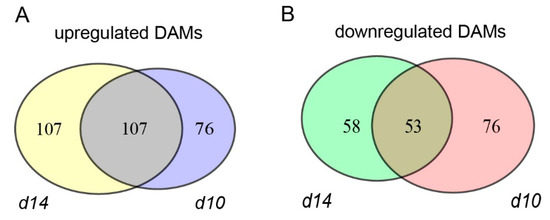 Schematic representation of metabolites with altered accumulation levels in the mutants. The number of up-regulated (A) and down-regulated (B) DAMs (differentially accumulated metabolites) in d10 and d14.