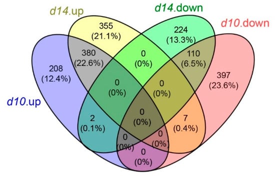 Summary of the differentially expressed genes (DEGs) in d10 and d14. Venn diagrams showing the number of significantly up-regulated and down-regulated genes that were uniquely or commonly regulated in the mutants.