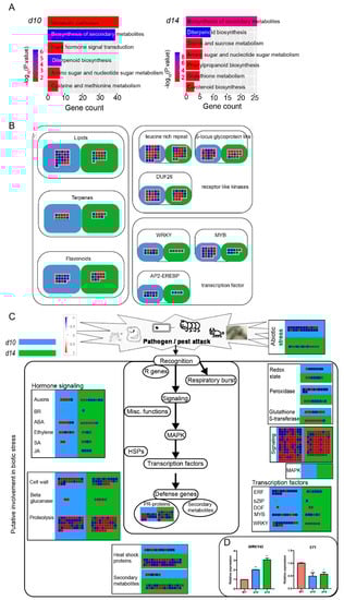 MapMan and KEGG analysis of the DEGs in the mutants. (A) Kyoto Encyclopedia of Genes and Genomes (KEGG) analysis of the differentially expressed genes (DEGs) in d10 vs. WT and d14 vs. WT. (B) Overview of the secondary metabolism-related DEGs in the mutants. (C) Enrichment of DEGs into biotic stress pathways in d10 (blue rectangle) and d14 (red rectangle). In the heat maps in B and C, red and blue indicate upregulation or downregulation in the mutants compared with the WT, respectively. Colored boxes in each region represent multiple variations in gene expression. (D) qRT-PCR based expression levels of WRKY45 and ST1 in d10, d14, and WT. The data are represented as mean ± SD of two biological replicates. The Student’s t-test analysis indicates a significant difference (compared with WT, * p < 0.05, ** p < 0.01).