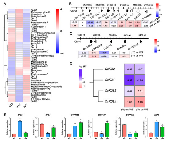 SLs regulate terpenoids via clustered or tandemly duplicated genes. (A) Metabolic profiling of terpenoids in d10, d14, and WT. Heat map visualized with the average content of terpenoids after normalization in at least two biological replicates. The expression of genes in the CPS2 cluster (B) and CPS4 cluster (C) in the mutants. In (B) and (C), the schematic diagram represents the CPS2 and CPS4 clusters, with the arrowheads representing the direction of transcription. (D) The members of the ent-kaurene oxidase-encoding family and their transcriptional responses in the mutants. In (B–D), the altered expression level of each gene is represented by log2(FC). Red and blue represent upregulation and downregulation, respectively. (E) qRT-PCR based expression levels of CYP71Z6, CYP71Z7, CYP76M7, CPS4, CPS2, and EATB in d10, d14, and WT. The data are represented as mean ± SD of two biological replicates. The Student’s t-test analysis indicates a significant difference (compared with WT, * p < 0.05, ** p < 0.01).