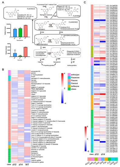 Affected flavonoid pathway in SL mutants. (A) Abundance of metabolites at the node of core flavonoid metabolism in d10, d14, and WT. (B) Heat map of flavonoids produced by tailoring reactions. The average content of each metabolite from individual biological replication of three genotypes was standardized and used to generate the heat map. (C) Heat map of the expression levels of genes with potential relatedness to the flavonoid pathway. The heat map was constructed with the average log2(FC) expression level in each mutant. ACGT: anthocyanidin 5 3-O-glucosyltransferase; ANR: anthocyanidin reductase; CHI: chalcone isomerase; CHS: chalcone synthase; DFR: dihydroflavonol-4-reductase; F3H: flavanone 3-hydroxylase; FLS: flavonol synthase; LDOX: leucoanthocyanidin dioxygenase; UFGT: UDP-glucuronosyl/UDP-glucosyltransferase family protein.