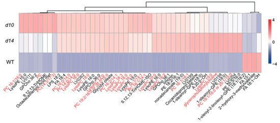 Effects of SLs on lipid metabolism. The relative content of lipids in d10, d14, and WT. The red font in the picture is choline related metabolites. LV0262, (23E)-23-(2-Diazonio-2,4-cyclopentadien-1-ylidene)-6,23-dihydroxy-2,2-dimethyl-11-oxo-9-[(stearoyloxy)-methyl]-5,7,10,22-tetraoxa-2-azonia-6-phosphatricosane 6-oxide; LV0204, 2-[(8-Carboxyoctanoyl)-oxy]-3-(palmitoyloxy)-propyl 2-(trimethylammonio)-ethyl phosphate; LV0199, (2S)-2-[(9-Oxononanoyl)-oxy]-3-(palmitoyloxy)-propyl 2-(trimethylammonio)-ethyl phosphate; LV0198, 2-[(7-Oxoheptanoyl)-oxy]-4-(palmitoyloxy)-butyl 2-(trimethylammonio)-ethyl phosphate; LV0111, 17-keto-4(Z),7(Z),10(Z),13(Z),15(E),19(Z)-Docosahexaenoic Acid.