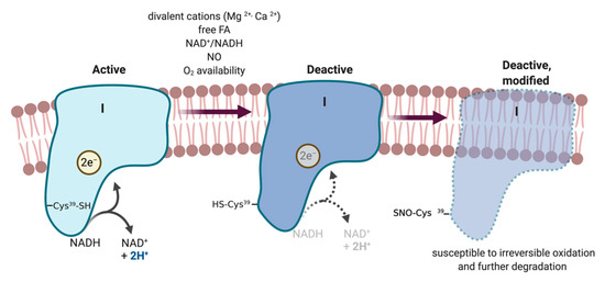 A peculiar property restricted to CI is what is called the active/deactive (A/D) transition, which can affect its susceptibility to modification, that may account upon persistent presence of NO or RNS. In brief, the enzyme spontaneously converts into the D-form after exposure to high physiological temperatures (>30 °C) or in the absence of substrate [86,87]. Deactive or dormant (D) enzyme is reactivated by a pulse of NADH, when the enzyme undergoes one or several slow turnovers or chemical conversions as NADH is oxidized and ubiquinone is reduced [87]. In highly metabolically active tissues, most of Complex I is in the A form. However, under conditions where the respiratory chain is in a reduced state due to the acute inhibition of cytochrome c oxidase and respiration rates are decreased, the catalytic efficiency of Complex I is slower because of the lack of the electron acceptor ubiquinone. As a result, the enzyme is converted into the D-form [88] (Figure 3).