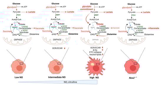 We posit that the biochemical basis of macrophage metabolic programming should now been re-interpreted with the full awareness that this process is orchestrated by NO and that the mitochondrial rewiring is a result of, rather than a direct mediator of inflammatory polarization. The refined, NO-centric model suggests that during macrophage stimulation, there is a rapid increase in glucose uptake and rapid induction of Irg1. This results in synthesis of citrate and itaconate from glucose-derived carbon. Nos2 is soon expressed and with the rise of intracellular NO levels PDH is directly suppressed reducing further utilization of glucose carbon in citrate and itaconate while diverting carbon to glucose-derived lactate. As NO levels continue to rise, ACO2 activity drops. Compensatory glutamine influx occurs at this point to make up for the lack of flux through PDH and the TCA [239]. This directs carbon through the TCA to support citrate, and itaconate production. Finally, itaconate production is limited due to NO suppression of ACO2 activity and accordingly glutamine-derived citrate accumulates. Lastly, as a result of substrate paucity Complex I reverts to the D form triggering the collapse of the electron transport apparatus and full glycolytic commitment (Figure 4).