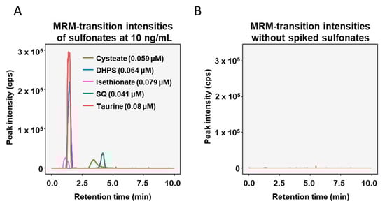 Chromatograms of diluted fecal supernatants spiked with 10 ng/mL of each sulfonate (A) and diluted fecal supernatants with no sulfonates added (B).
