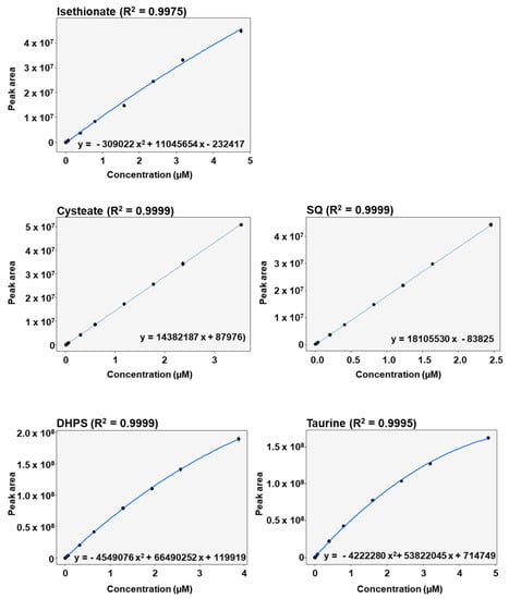 All the calibration curves were measured in seven technical replicates. A linear response was observed for cysteate (R2 = 0.9999) and for SQ (R2 = 0.9999) in the range of LLOQ to ULOQ, with satisfactory Pearson regression coefficients (Figure 3). Isethionate (R2 = 0.9975), DHPS (R2 = 0.9999) and taurine (R2 = 0.9995) displayed non-linear responses in the range of LLOQ to ULOQ, which was accurately modelled using quadratic polynomial functions (Figure 3). Thus, the method proved to be appropriate for simultaneously measuring the five sulfonates in complex fecal matrices.