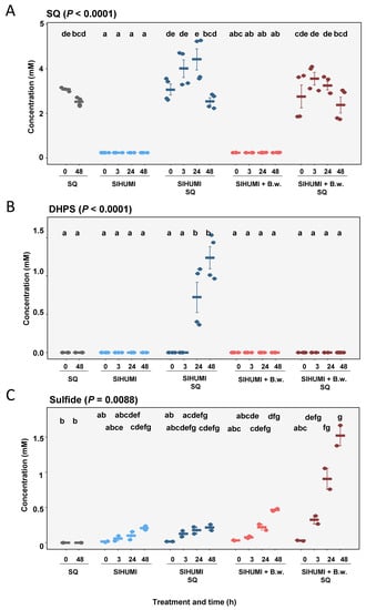 Mean concentrations of SQ (A), DHPS (B) and sulfide (C) at 0, 3, 24 and 48 h in substrate control with SQ, simplified human intestinal microbiota (SIHUMI), SIHUMI with SQ, SIHUMI and Bilophila wadsworthia, and SIHUMI and Bilophila wadsworthia with SQ. Error is SEM. P calculated according to Kruskal–Wallis tests with post hoc Dunn tests. Differing letters depict significant differences between groups.