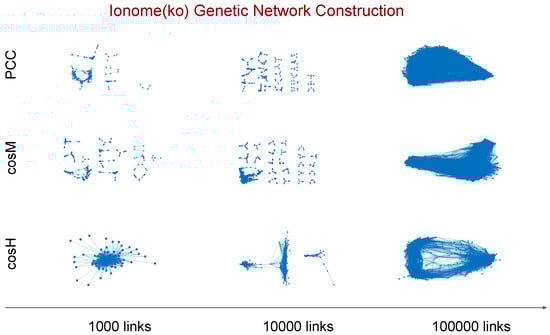 This procedure allows for a robust comparative analysis of the genetic networks inferred using the different measures at any fixed value of the relevance threshold n. In Figure 2, we show the topology of the genetic relevance networks inferred from the ionome (ko) data set for different values of the relevance threshold n when using P C C , c o s M , and c o s H . To improve visualisation, we plot only the connected subgraphs with a size larger than or equal to five nodes. An analysis of the false positive rate of associations for the inferred relevance networks is reported in Appendix D.