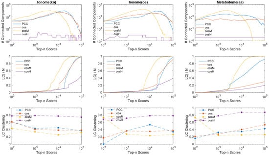 The process of inference of a genetic network from a given data set while gradually increasing the relevance threshold (Figure 2) can be regarded as a reverse percolation process on the network, in which edges are sequentially added one at a time between the same set of N vertices [41,42]. This fact allows us to obtain insights about the inference power and performance of the similarity measures based on network theory considerations. Our first analysis focuses on three network descriptors, namely (i) the number of connected components—that is, the number of connected subgraphs in the network; (ii) the size of the largest component (LC)—that is, the number of nodes present in the largest connected component of the graph; and (iii) the average local clustering coefficient [43,44] of the largest component—that is, the average fraction of triangles over triplets closed by a node in the LC. The clustering coefficient measures how well the nodes in a graph tend to cluster together, and it works as an indicator for the network modularity [45,46,47]. In Figure 4, we plot the number of connected components, the size of the LC, and the average clustering coefficient of the LC measured from the inferred networks in the top n genetic associations ranked according to the different measures considered. Interestingly, the curves reveal that: