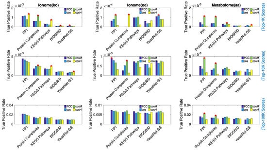 Figure 5. Comparison in performance of the similarity measures under study in recalling previously known biology. Protein–protein interactions (PPI), co-occurrence in protein complexes, co-occurrence in metabolic pathways (KEGG), genetic interactions (BIOGRID), and associations based on Gene Ontology (GO) Terms (YeastNet GS) were considered separately as ground-truth for genetic associations. For each experimental data set of ionome/metabolome, the true positive rate of associations found in the top 1000 scores (Top), in the top 10,000 scores (Middle), and in the top 100,000 scores (Bottom) is reported, respectively, for each of the similarity measures under study. The red stars mark the cases in which the highest true positive rate differs by at least 10% with respect to the second highest. We considered this difference in percentage as the gain in performance associated to the best performing measure. c o s M appears to consistently outperform the other measures in recalling protein–protein interactions, protein complexes associations, and biological pathways co-occurrence in the networks extracted from the metabolome (aa) data set.