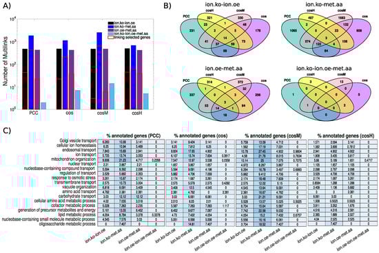 When we constructed the multiplex network from the three single-network layers inferred from each data set using the top 100,000 significant associations, we observed that the multilink statistics did not differ in terms of orders of magnitude across the similarity measures considered (Figure 6A), with the exception of the multilinks of the type ionome.oe-metabolome.aa for which c o s M provided the largest number of links (2537) and c o s H the lowest (685). Each measure, however, had a substantial fraction of characteristic multilinks that did not overlap with the other measures (Figure 6B). The lowest specificity was observed for P C C with only 26.8% of characteristic ionome.ko-metabolome.aa multilinks, while the highest specificity was observed with c o s M (respectively 92.9% of ionome.ko-ionome.oe-metabolome.aa multilinks and 77.8% of ionome.oe-metabolome.aa multilinks that are not in common with other measures). Furthermore, we checked the content of relevant biological information of non-layer-specific (NLS) multilinks by considering a subset of GOSlim Biological Process Ontology terms from the SGD database [53] that are related to metabolic processes and cellular ion homeostasis maintenance [34,54]. When we looked at the four subnetworks defined by each specific class of NLS multilinks, we found that those constructed with c o s M included the largest number of genes annotated to the ontology categories considered (Figure 6C). c o s M also yielded the largest number of ionome.ko-metabolome.aa multilinks between the annotated genes considered, while for the two multilinks classes ionome.oe-metabolome.aa and ionome.ko-ionome.oe, c o s H revealed the largest number of connections among the annotated genes (Figure 6A).