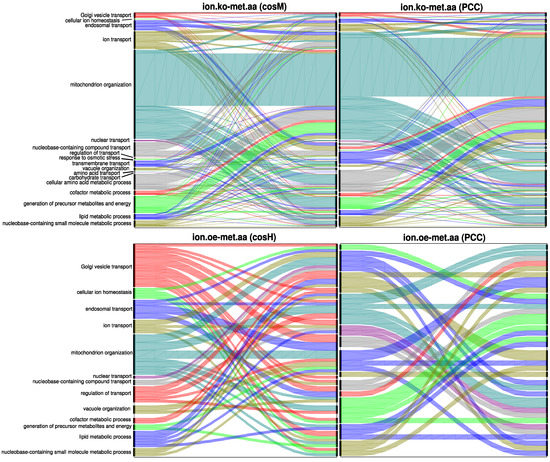 Figure 7. Flow diagrams representing the proportion of multilinks between genes annotated to selected GOSlim classes of biological processes related to ion transport and metabolism. The proposed similarity measures are able to reveal new levels of functional associations between genes: (Top) The flows generated by c o s M and by P C C for the ionome.ko-metabolome.aa multilinks are compared. (Bottom) The flows generated by c o s H and by P C C for the ionome.oe-metabolome.aa multilinks are compared. Those are the classes of multilinks for which c o s M and c o s H respectively produce the highest flow diversity with respect to P C C .