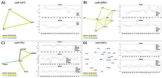 Figure 8. Examples of genes used for hypothesis construction via multiplex neighbourhood analysis. Only non-layer-specific multilinks are plotted, as they represent evidence detected across multiple omic layers (respectively, ionome.ko-ionome.oe, ionome.ko-metabolome.aa, and ionome.oe-metabolome.aa). The non-layer-specific multilink neighbourhood of genes LST7 in the c o s M multiplex (Panel A), QDR2 in the c o s M multiplex (Panel B), TPI1 in the c o s M multiplex (Panel C), and GCS1 in the c o s H multiplex (Panel D) are shown together with their ion/amino acid profiles.
