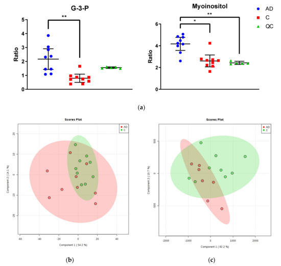 Two significantly altered metabolites were identified within the Newcastle cohort: increased myo-inositol and glycerol-3-phosphate in cases compared to controls (see Figure 1a; see Supplementary Materials B for table of all identified metabolites). However, no separation was found between cases and controls, or between individuals of different gender, age, disease stage, PMD, CAA, or brain weight when mapped onto a (PLS-DA) plot (see Figure 1b). Both quality control measurements (QCs) and (QLs) were closely clustered (with the exception of the first QL; see Supplementary Figure C2), consistent with a successful GC run.