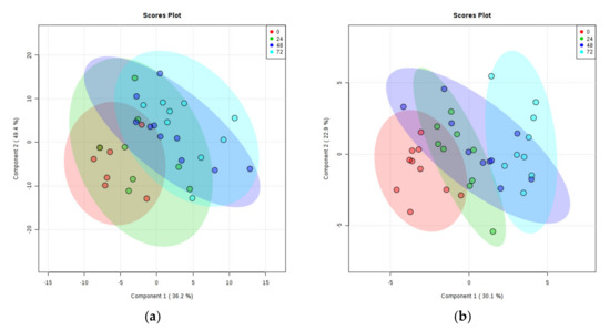 PLS-DA plotting again showed clear separation of different PMD groups, sequentially from 0 to 72 h (see Figure 3b). One sample was identified as an outlier and removed from the plot (see Supplementary Materials E for labelled data points).