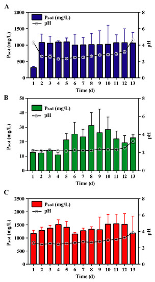 Changes of soluble-phosphorus (Psol) by Penicillium oxalicum with (A) tricalcium phosphate, (B) iron phosphate, and (C) dipotassium phosphate as the sole P source during 13 days of culture. Data are the average result of three replicates with standard deviations.
