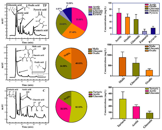 Although oxalic, citric, gluconic, formic, malic, lactic, and acetic acids were detected in all treatments, the yield of low-molecular-weight organic acids (LMWOAs) in P. oxalicum was remarkably different across treatments. (Figure 2). The concentrations of total LMWOAs in TP peaked at 200.7 mg/L on day 3 (Figure S1B), including acetic acid (33.9%, 68 mg/L), oxalic acid (27.4%, 55 mg/L), gluconic acid (23.8%, 47.8 mg/L) and fumaric or pyruvic acid (14.9%, Figure 2). However, total LMWOAs concentration in the IP treatment reached 1786 mg/L (Figure S1B), and the predominant components were malic acid (49.8%, 890 mg/L), gluconic acid (34.5%, 617 mg/L) and oxalic acid (15.6%, 279 mg/L). In the C treatment, similar LMWOAs profiles were obtained as in the TP treatment, peaking on day 3 at 601.1 mg/L (Figure S3B); however, the main LMWOAs were tartaric acid (314 mg/L), acetic acid (194 mg/L) and gluconic acid (92 mg/L). Across the three treatments, more types of LMWOAs were found in TP treatments compared with other treatments.