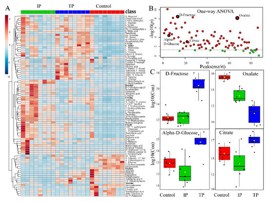 Metabolic analysis in P. oxalicum with tricalcium phosphate (TP), iron phosphate (IP), and dipotassium phosphate (C) exposure. (A) Heat map visualization, hierarchical clustering analysis (HCA) provided intuitive visualization of all 73 identified metabolites with generalized logarithm transformation of concentration. Relative metabolite levels of three treatments were performed using an average clustering algorithm and Pearson’s correlation distance measure. (B) Important features selected by one-way ANOVA and Tukey’s HSD with p-value threshold 0.05 (Table S1). Data represent −log10 (raw p-value) changes. The dotted line represents the threshold p = 0.05. (C) Boxplot of 4 selected metabolomics features from the one-way ANOVA. The black dots represent the −log10(raw concentrations) from all the eight samples, and the notch indicates the 95% confidence interval around the median of each treatment. The mean concentration of each treatment is indicated with a yellow diamond.