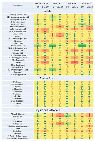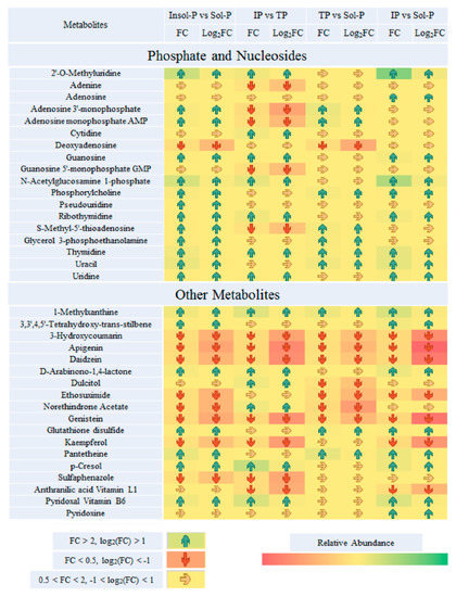 Paired fold change analysis of Important metabolites that are affected by P sources (insoluble P (Insol-P) and soluble P (Sol-P), tricalcium phosphate (TP) vs. iron phosphate (IP), TP vs. Sol-P and IP vs. Sol-P). TP refers to the tricalcium phosphate group; IP refers to the iron phosphate group; Insol-P refers to insoluble P, including TP and IP groups; Sol-P refers to soluble P (dipotassium phosphate) group. Arrows of average fold changes (FC) and log2(FC) are listed and painted with increased coded “blue” (FC > 2, log2(FC) > 1) and decreases coded “red” (FC < 0.5, log2(FC) < −1) with significant changes (p < 0.05). The color of arrow listed “yellow” represent the undetected metabolites or metabolites with no significant FC values changes (0.5 < FC < 2, p < 0.05).