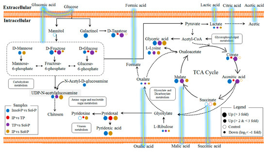 Important metabolites were selected from the volcano plot and the OPLS-DA loading S-plot (Figure S9). Based on the Kyoto Encyclopedia of Genes and Genomes pathway libraries, 14 intracellular metabolic pathways were up-regulated with Insol-P treatment (p < 0.05), involving amino sugar and nucleotide sugar, glyoxylate and dicarboxylate, lysine degradation and biosynthesis, and the TCA cycle (Figures S7 and S8). Detailed differences in the metabolites suggest that the levels of central metabolism differed markedly between the Insol-P and Sol-P treatments in P. oxalicum (Figure 4). Specifically, sugar and sugar alcohols (mannose, glucose, fructose, tagatose, galactinol, and glyceric), LMWOAs (citrate, malate, aconitic, aminoadipic, and propionic acid), amino acids (lysine, valine, methionine, leucine, arginine, tyrosine, serine, uridine, glutamine, and saccharopine) and phosphates (phosphorylcholine, glycerol 3-phosphoethanolamine, and adenosine monophosphate) were at relatively higher concentrations in P. oxalicum fermented with Insol-P. In contrast, only oxalic acid derived from the glyoxylate and dicarboxylate pathway, as well as lactic acid derived from pyruvate metabolism, were at higher concentrations in the Sol-P control. Gluconic, citric, succinic, and malic acids had similar FC increments in intracellular metabolism compared with extracellular acid production, while lactic and oxalic acid showed the opposite pattern (Figure 2 and Figure 4).