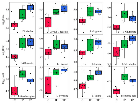 Changes in concentration distribution of important amino acid metabolites in P. oxalicum with tricalcium phosphate (TP-Blue), iron phosphate (IP-Green), and dipotassium phosphate (C-Red) treatments. The black dots represent the concentration of amino acids from eight samples.